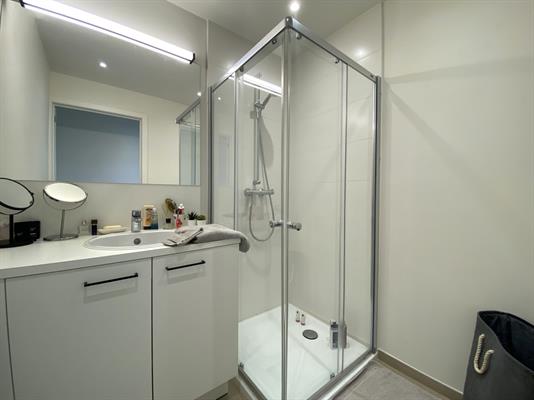 Indeling van het appartement op de 2e verdieping: inkomhal met gastentoilet, lichtrijke leefruimte met zithoek en eetplaats uitgevend op het zonnig rustig terras achteraan met mooi verzicht, volledig geïnstalleerde open keuken met een luxueuze afwerkingsgraad en voorzien van alle moderne comfort uitgevend op het terras vooraan, 1e badkamer met lavabo en douche, 2 ruime slaapkamers (waarvan 1 momenteel wordt gebruikt als dressing), aparte geriefelijke berging met aansluiting voor wasmachine/droogkast.